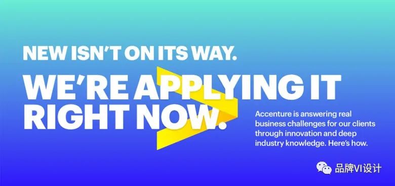 >。除了利用更具吸引力的圖片形象、醒目的字句以及大膽的色彩以外,全新的品牌計(jì)劃還將埃森哲沿用長(zhǎng)達(dá)十年的標(biāo)志符號(hào)--“>”置于更顯著的位置。