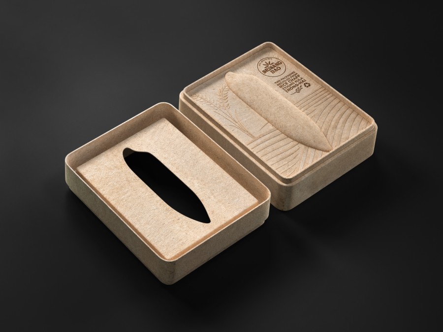 Thung Kula Ronghai是泰國著名的稻米產(chǎn)區(qū),其優(yōu)質(zhì)的稻米生產(chǎn)享譽(yù)世界。在受控的環(huán)境中,每年的大米產(chǎn)量有限。因此,這種有機(jī)大米保證了最好的質(zhì)量和不含化學(xué)物質(zhì)。大米包裝設(shè)計(jì)面臨的挑戰(zhàn)是如何體現(xiàn)有機(jī)水稻的生長過程。Prompt Design設(shè)計(jì)的包裝袋使用的是來自于稻米去殼過程的廢棄物——糠皮。包裝模壓成型,盒蓋頂部為稻形壓花,盒子里裝著米袋。此外,這個(gè)大米包裝盒使用后可以用作紙巾盒。真正體現(xiàn)了環(huán)保的初衷。